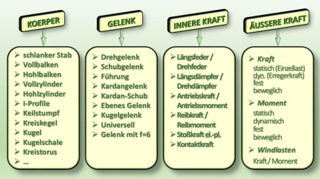 Bedingt durch das objektorientierte Datenmodell wird die Beschreibung eines komplexen MKS für MEPHISTO sehr vereinfacht. So enthalten die Eingabedaten Informationen nur von vier Objektklassen: Körper, Gelenk, inneres Kraftelement, äußeres Kraftelement.